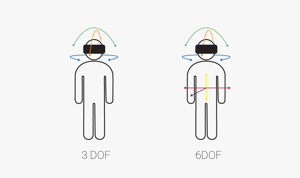Degrees of freedom or DOF refers to the different degrees of movement available to an object inside a space. There are six types of movement that can be further divided into translation (straight line movement in a specific direction) and rotation (a movement about the x-, y-, or z-axis) movesets. For instance, hitting a baseball with a baseball bat is not a single movement, but a complex combination of rotations and translations performed at the same time. An object can freely translate along each of the three perpendicular axes. These movements constitute the first “three degrees of freedom”: surge (forward and backward motion), heave (upward and downward motion), and sway (leftward and rightward motion). An object can also simultaneously rotate along the three axes. These movements constitute the other three degrees of freedom: roll (tilting from side to side), pitch (tilting forwards and backwards), and yaw (tilting left and right). Together these add up to six degrees of freedom or 6DOF and can describe every possible movement of an object. This is an essential concept for correct positional tracking of human movement in a VR environment.