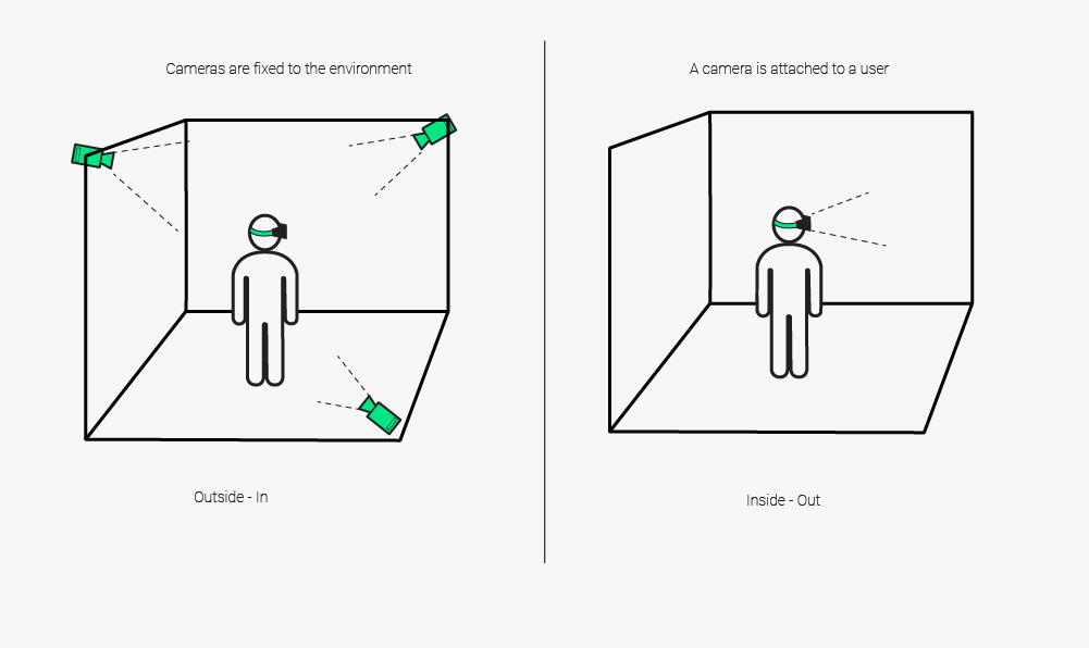Inside-out and outside-in tracking refer to the 2 different approaches to monitoring the user’s movements outside of VR in order to mirror them inside of the VR environment. Outside-in tracking focuses on placing cameras, sensors, and other tracking devices around the user to cover whatever area is used to simulate the virtual box the user will interact with. These devices trace the locations of any moving objects in the scene and translate them into virtual movements. While this process has both high accuracy and low latency, it suffers from a hard limit to its range since the sensors don’t move, as well as an inability to record anything outside of the line of sight of the sensors. Meanwhile, inside-out tracking uses the sensors placed inside of the VR headgear exclusively. The headset’s position is marked and readjusted constantly to keep track of the current position of the user in the VR environment, and the camera(s) on the headset try to discern pre-placed markers out of the user’s real surroundings, which serve as reference points for the user’s movements. However, inside-out tracking can function without the use of markers, as well; markerless inside-out tracking uses positional tracking of objects and observes natural features of the camera’s surroundings in order to align the user with respect to these features. While this method is both cheaper and far more flexible than either of those above, it lacks accuracy, can have a much higher latency than other methods of tracking, and requires that all processing is done solely by the headset.