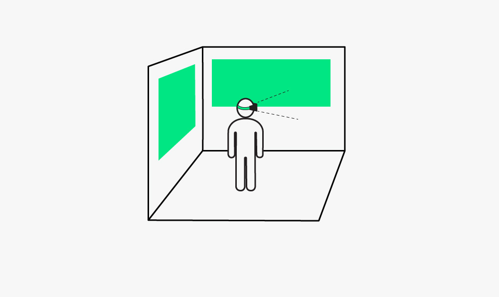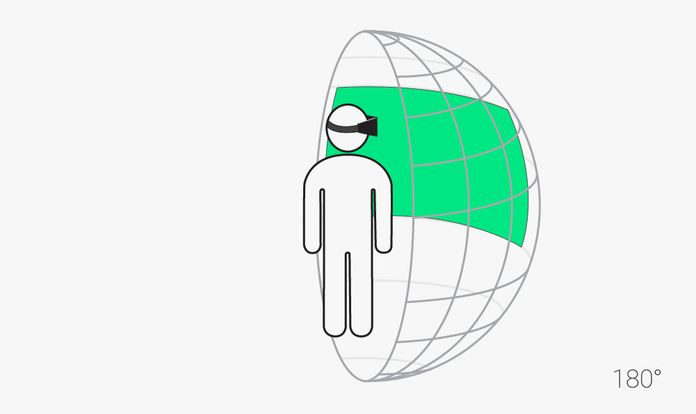 Videos showing 180° of a scene from the user’s point of view, meaning that the video is limited to nearly the same line of sight as the human eye and ‘cut off’ on either side of the viewer’s head, at the edges of their line of sight. In contrast to 360° video, this setup allows for a more directed viewing experience and reduces the amount of movement needed. Limiting the field of view to 180° also avoids stretching pixels as much, providing a much sharper (see: higher resolution) image than a 360° video would when viewing the same space.