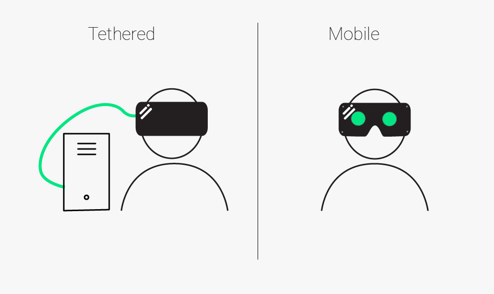 There are currently two different types of headsets for VR: tethered and mobile. Tethered headsets are physically connected to a powerful computer using wires, allowing them to make use of the processing power available to track positions, movements, etc. Tethered headsets give the user a freedom of movement beyond turning their heads and additional interactivity. However, they require the user to stay within a certain distance of the computer, as the user’s headset must stay connected physically to the computer, and are relatively expensive compared to their mobile counterparts. Mobile headsets can be taken anywhere, since they do not require a physical connection to a processor, and are far cheaper than tethered headsets. While they don’t limit the movements of the user, their lack of additional computing power makes them unable to react to the user’s movements and limits them to look around the environment without interacting with or moving around it.