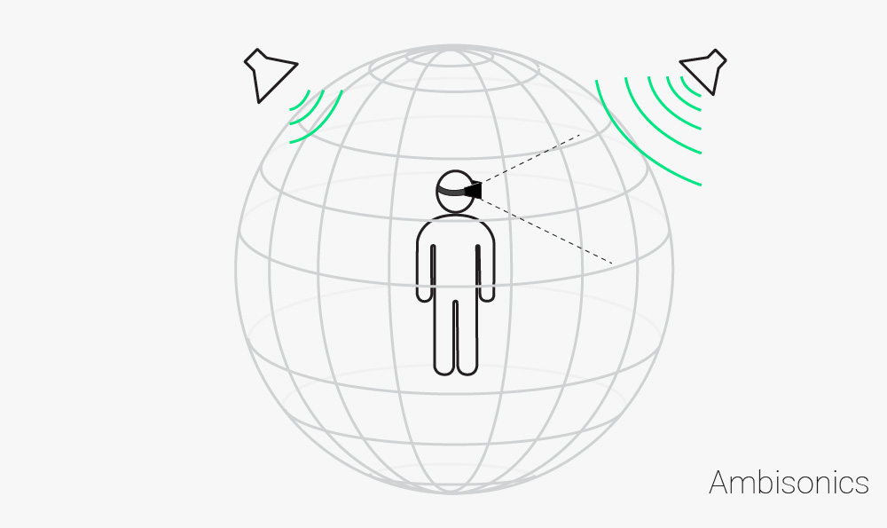 Ambisonics is the name given to a method of recording and reproducing sounds in 360°. This is done using a special array of at least 4 microphones to capture sounds from every direction. These sounds are then stored and decoded for use with surround sound and 360° videos. They provide particularly clear recordings and can represent every bit of audio information within the recorded area. However, since an ambisonics device can only record sounds from a single location, it is not as useful in the context of a larger 3D environment or when simulating movement.